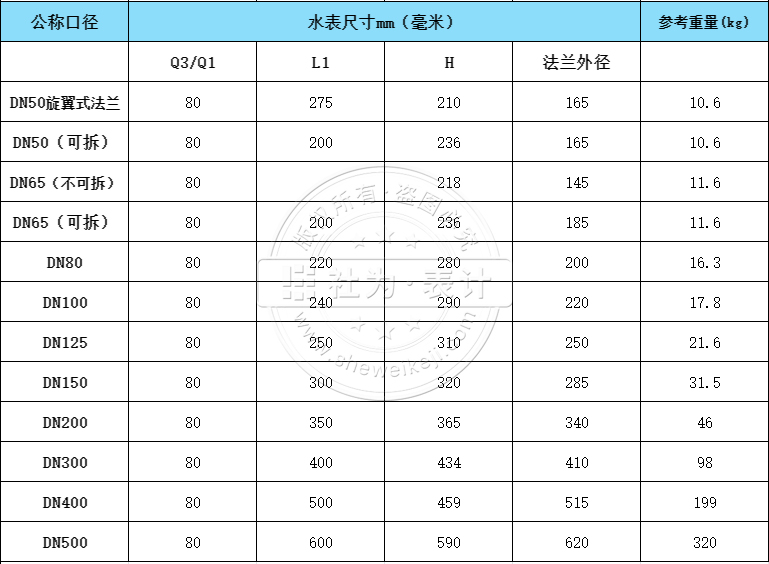不同的應(yīng)用場景中水流量的大小不同,以社為/捷先遠(yuǎn)傳大口徑水表為例,水表尺寸有50mm~300mm可選,不同口徑大小則對應(yīng)了不同的最小流量(Q1)、分界流量(Q2)、常用流量(Q3)以及過載流量(Q4)等,表示該口徑可以測量該范圍的用水量,如:DN50大口徑水表Q1=0.50m³/h、Q2=3.15m³/h、Q3=40m³/h、Q4=50m³/h。