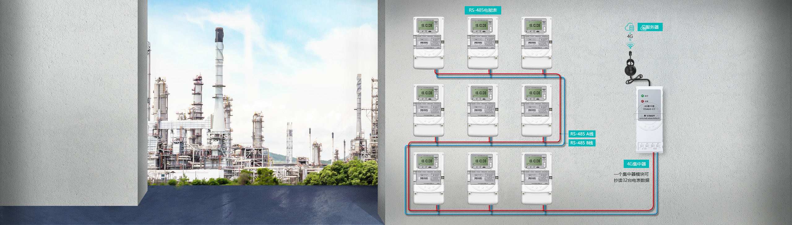 在256臺(tái)電表內(nèi)任意一臺(tái)電表插入一個(gè)抄表模塊,各電表RS-485接口互聯(lián),電表即實(shí)現(xiàn)了聯(lián)網(wǎng)。