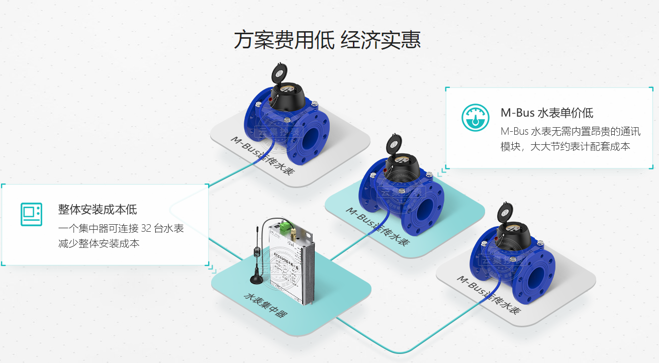 此方案具有一下幾點(diǎn)優(yōu)勢(shì):(1)整體方案費(fèi)用低:水表自帶M-bus接口,無(wú)需內(nèi)置通訊模塊,水表單價(jià)較低。(2)通訊穩(wěn)定,數(shù)據(jù)準(zhǔn)確:有線連接,數(shù)據(jù)傳輸不受外界影響,讀數(shù)誤差小。(3)數(shù)據(jù)傳輸速度快:數(shù)據(jù)通過(guò)M-bus總線快速讀取,數(shù)據(jù)可快速打包處理。