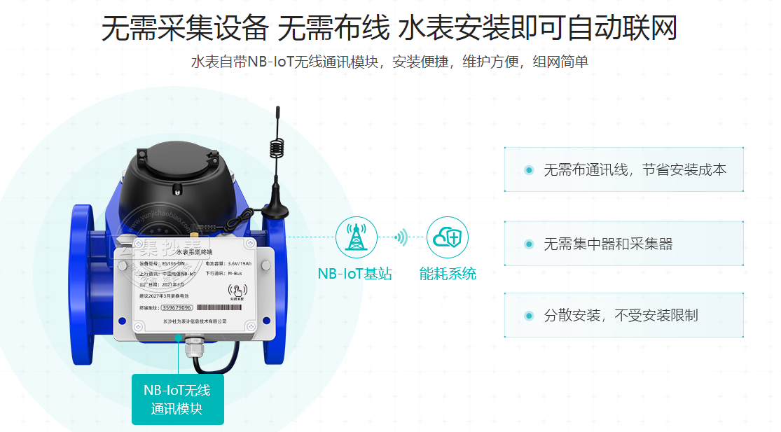 NB無線組網抄表方案,不需要再額外配置采集設備和電力線,不管水表安裝的位置距離有多分散有多遠,水表與系統(tǒng)之間都可以交互信息,實現遠程抄表,是工廠、工業(yè)園區(qū)、公共建筑以及其他水表分散安裝,且需要實現通訊功能的場合的最佳選擇。