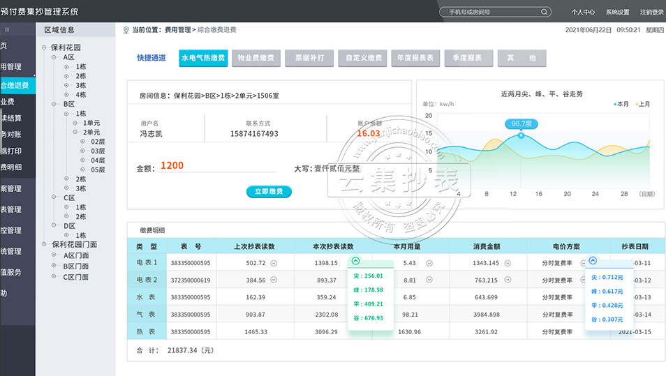 另外針對城市居民住宅小區(qū)物業(yè)收費(fèi)問題,云集水電抄表管理系統(tǒng)也可以實(shí)現(xiàn)將物業(yè)費(fèi)和水電費(fèi)綁定,業(yè)主需要同時(shí)繳納各項(xiàng)費(fèi)用,才可以繼續(xù)使用水電氣。而且這些業(yè)主都可以直接在手機(jī)上實(shí)現(xiàn),解決了業(yè)主和物業(yè)上班時(shí)間沖突,沒時(shí)間繳納費(fèi)用的問題,也簡單便捷。